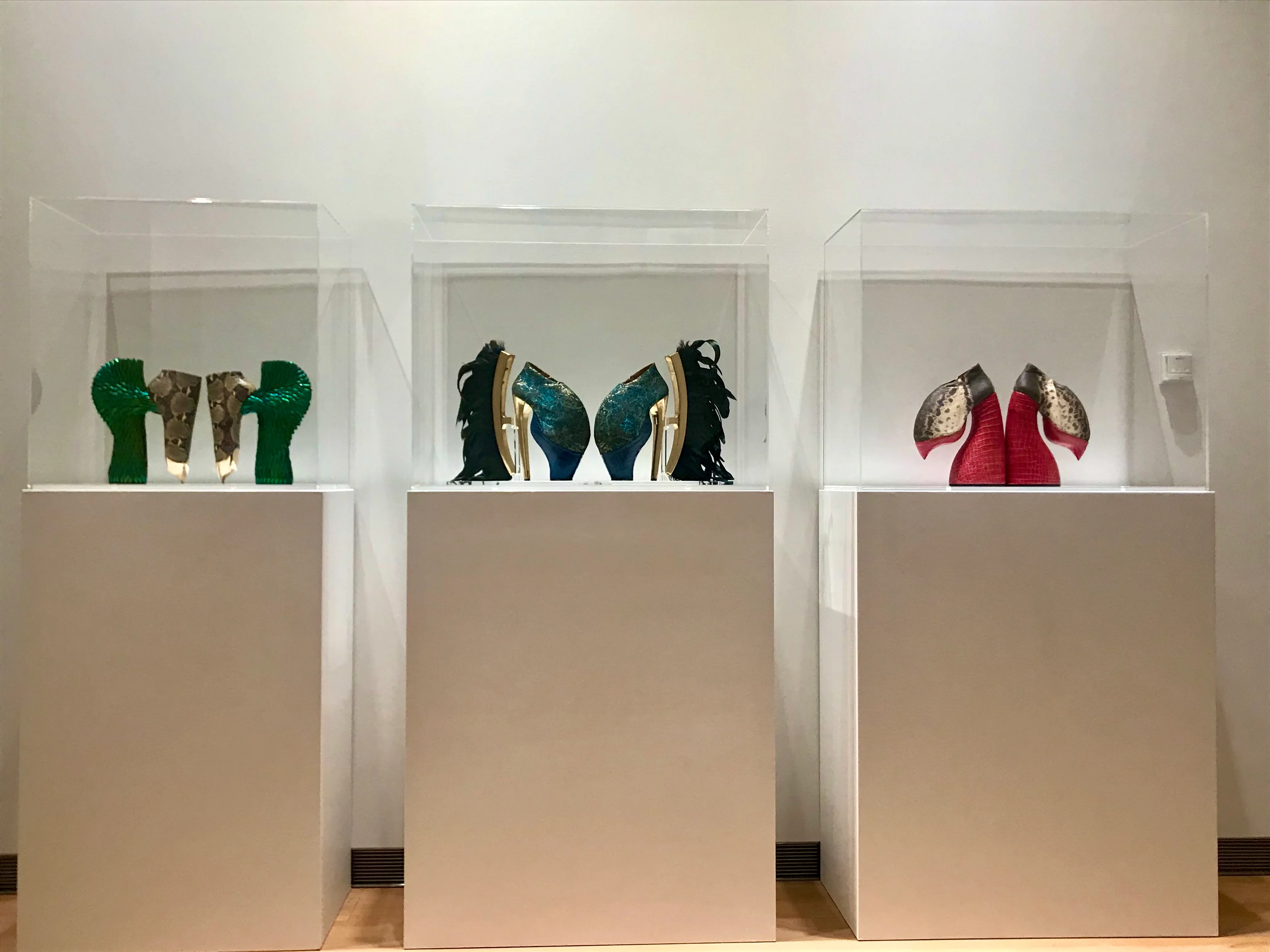 Surrealistic shoe creations by Japanese designers Noritaka Tatehana and Masaya Kushino synthesize animal hide with insects and bird feathers, so that the wearer feels transformed into a hybrid creature. Tatehana is famous for his heel-less shoes, inspired by the tall geta of courtesans in the past. He has worked as pop diva Lady Gaga’s shoemaker for almost thirteen years. Kushino’s outlandish stilettos are made from python, crocodile, and cow skin attached with ostrich and crow feathers and the fur of lambs, foxes, and goats. Tatehana and Kushino's footwear narrows the boundaries between eclectic fashion and dreamlike art.