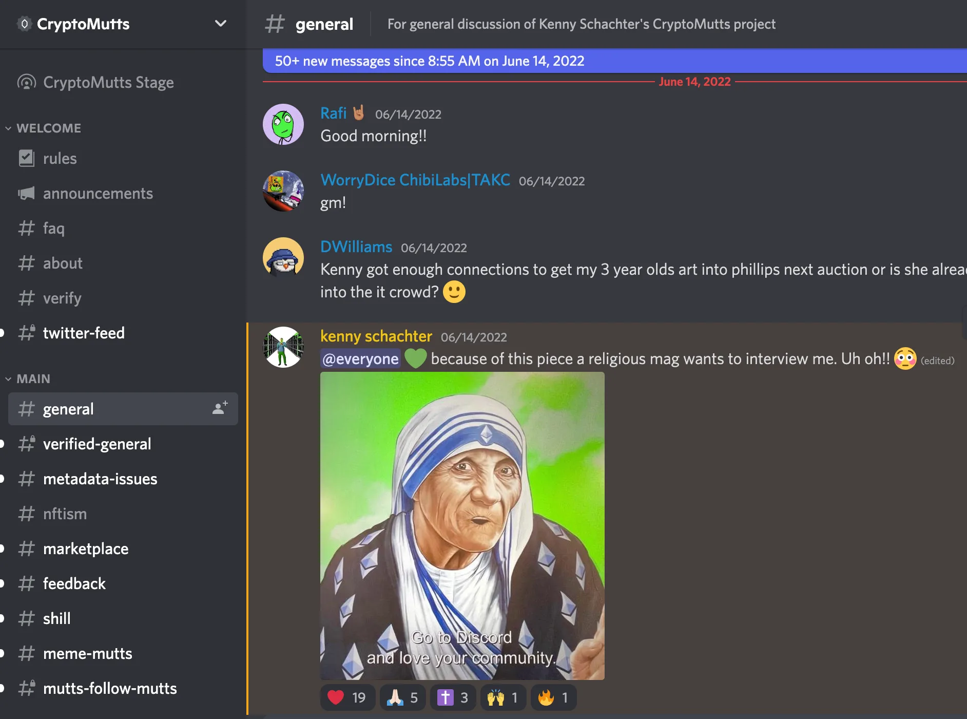 ──Let’s talk about your CryptoMutts PFP project. There are 10,000 randomly generated images of humans and humanoids, each with different traits, and if you “adopt” a CryptoMutt, the owner gains access to an “Art Club” that you run, including direct communication with you through a very robust Discord channel.