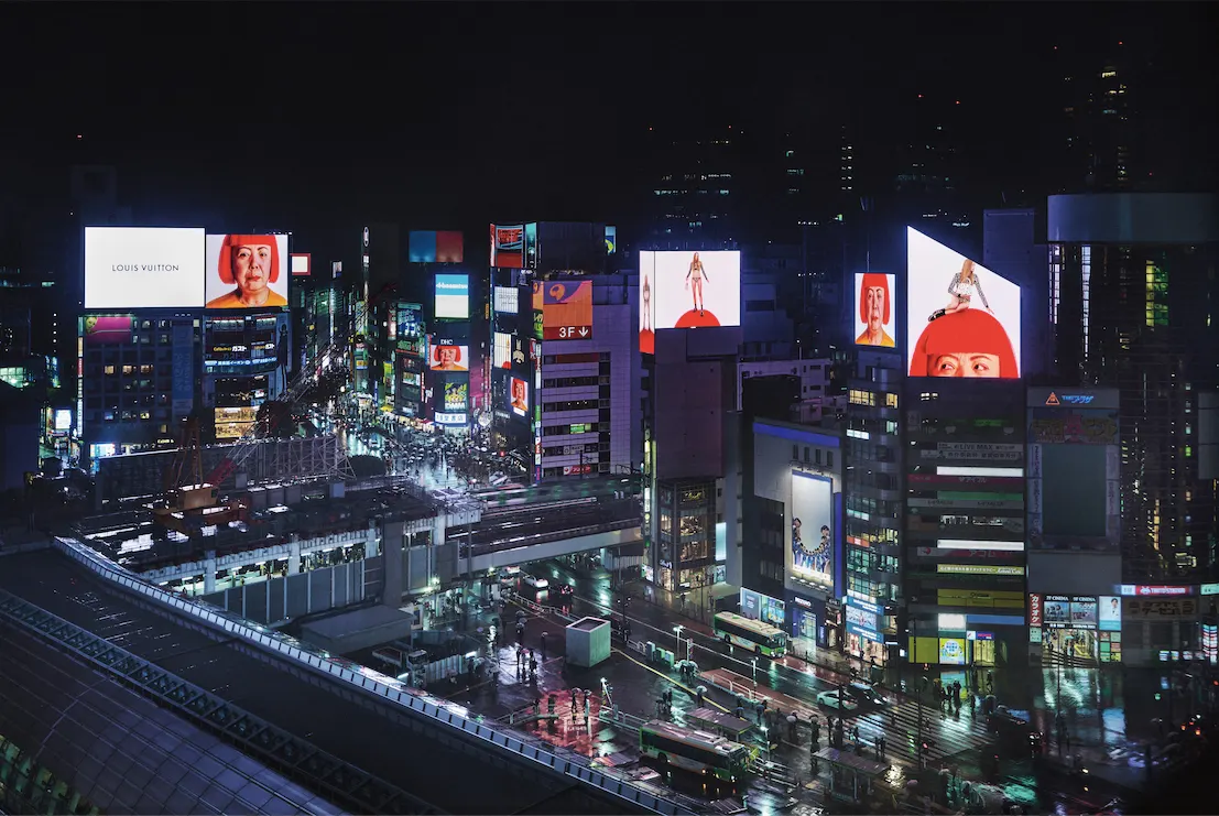 Look up when you are passing through Shinjuku next time - Yayoi Kusama and Louis Vuitton trunks decorated with polka dots appear on the 3D screen near the East exit of Shinjuku station (Dates: November 29 - December 7, 2022; Hours: 07:00 - 25:00).